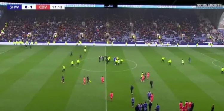 10月4日讯 据《太阳报》报道,在谢菲尔德星期三与考文垂的比赛中,场面一度失控,球迷冲入场内引发比赛中断。比赛开场仅仅10分钟,主场球迷便涌进场地,声讨俱乐部老板钱斯里的管理方式,局势一度紧张。主裁判随即叫停比赛,经过大约五分钟的等待,安保人员终于将闯入的球迷带离,比赛才得以恢复。
